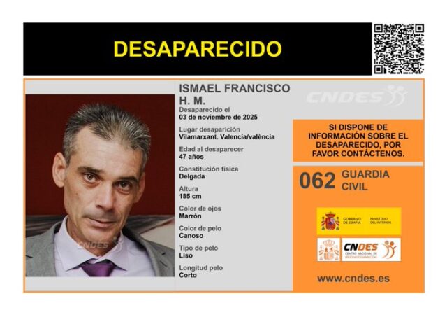 Las autoridades han activado una alerta de desaparición tras perder la pista de Ismael Francisco H. M., un hombre de 47 años, desaparecido el pasado 3 de noviembre de 2025 en Vilamarxant, localidad de la provincia de Valencia. La alerta ha sido difundida oficialmente por el Centro Nacional de Desaparecidos (CNDES) y la Guardia Civil, quienes han solicitado colaboración ciudadana para dar con su paradero.