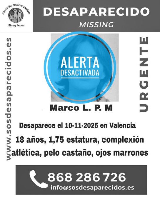 Marco L. P. M, de 18 años, fue reportado como desaparecido el 10 de noviembre de 2025 en Valencia. Mide 1,75 m, tiene complexión atlética, pelo castaño y ojos marrones. La alerta por su desaparición ha sido desactivada tras su localización.