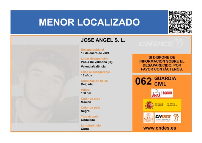 Después de más de diez meses de angustia y búsqueda incesante, José Ángel S. L., un menor de 16 años que había desaparecido el pasado 16 de enero de 2024 en La Pobla de Vallbona (Valencia), ha sido localizado. La Guardia Civil ha confirmado que el joven se encuentra en buen estado de salud, aunque no se han revelado detalles adicionales sobre las circunstancias en las que fue hallado.