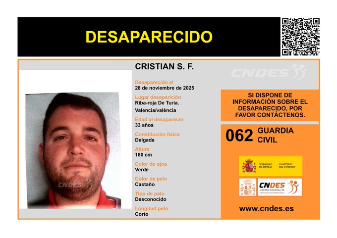 La Guardia Civil investiga la desaparición de Cristian S. F., un hombre de 33 años que fue visto por última vez el 28 de noviembre de 2025 en Riba-roja de Túria, un municipio a las afueras de Valencia. La alerta fue emitida por el Centro Nacional de Desaparecidos (CNDES) tras la denuncia presentada por su entorno familiar.