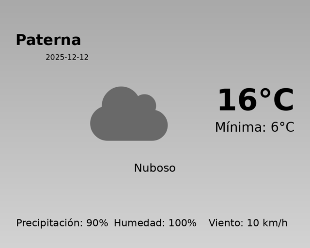 Hoy en Paterna, el clima tiene características de invierno perfectamente definidas, con un día marcado por cielos cubiertos y alta probabilidad de lluvia. La temperatura máxima alcanzará los 16 °C, mientras que la mínima descenderá hasta los 6 °C.