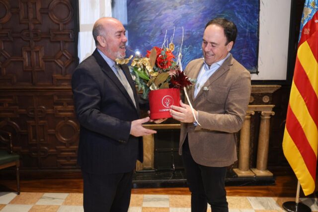 Valencia. El día de hoy, el presidente de la Generalitat, Juanfran Pérez Llorca, ha sido el afortunado receptor del tradicional centro de Navidad que cada año otorga el Gremio Artesano de Floristerías como una forma de desear unas felices fiestas. La entrega del hermoso arreglo floral fue realizada por el presidente de la entidad, Juan Lluesma, quien resaltó la importancia de las tradiciones en la celebración de la Navidad en nuestra comunidad. Este gesto representa no solo la alegría de la temporada, sino también el arte y el compromiso de los floristas locales.