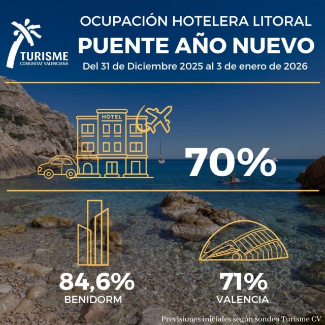 La Conselleria de Industria, Turismo, Innovación y Comercio ha revelado que los hoteles en la Comunitat Valenciana proyectan una ocupación media cercana al 70% para el periodo que abarca desde Nochevieja hasta el 3 de enero. Se destacan lugares como Benidorm, que espera una ocupación del 84,6%, y el litoral de la provincia de Alicante con 71,9%.