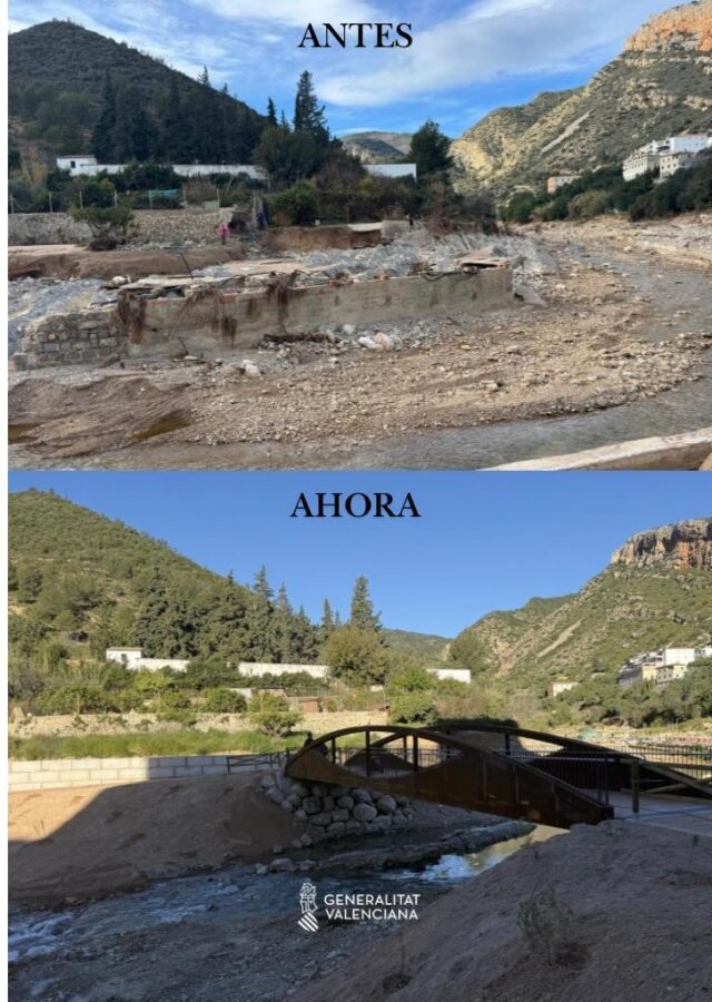 La Generalitat de Valencia ha iniciado la recuperación de las pasarelas de Cerrao y del camino del Cementerio en Sot de Chera, que fueron devastadas por una riada anterior. Estas estructuras se reponen justo a tiempo para las vacaciones de Semana Santa, permitiendo un acceso peatonal seguro sobre el río Sot.