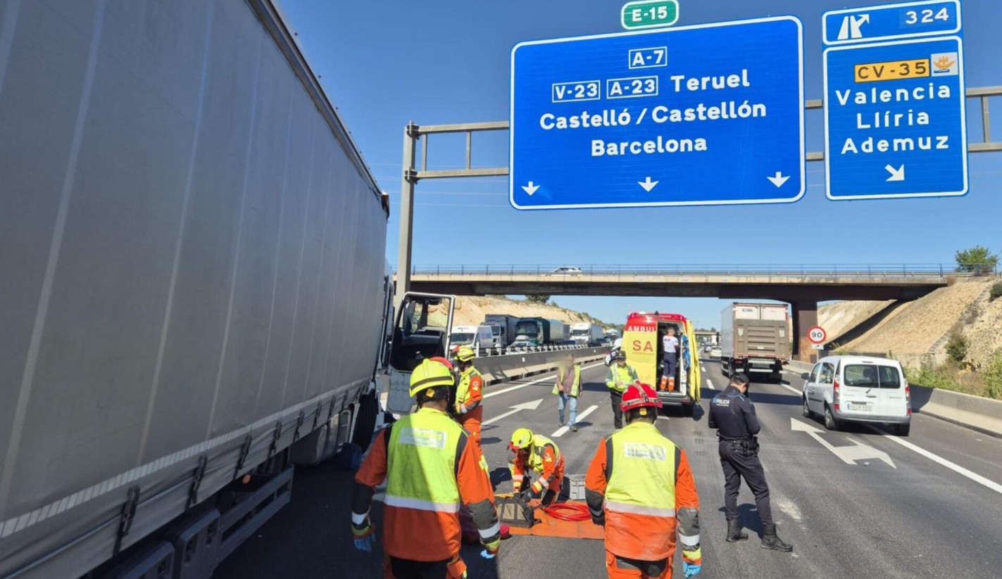 Un accidente entre dos camiones registrado este martes en la A-7, a su paso por el término municipal de Paterna, ha dejado a un hombre de 59 años herido. El suceso obligó a desplegar un operativo de emergencia que incluyó la excarcelación del conductor de uno de los vehículos implicados.